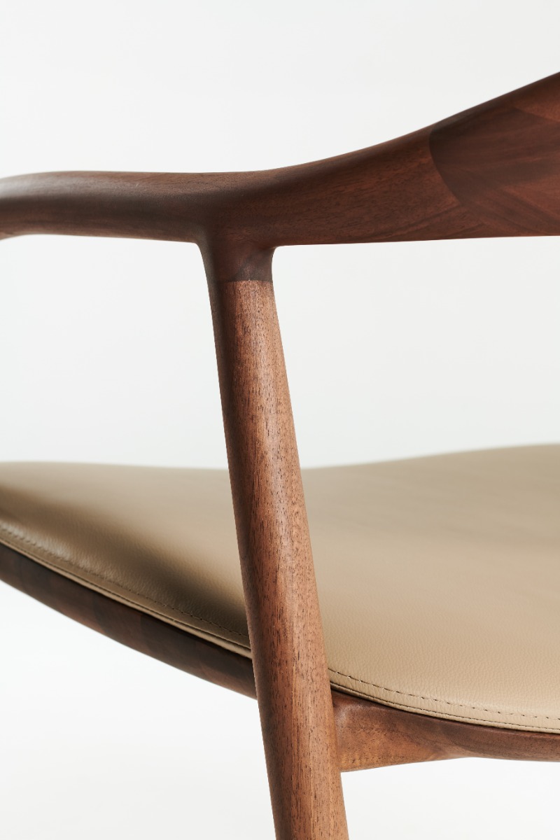 A chair that features sensual and fluid form expressed through soft, angular edges and transitions. Its tilted and arched backrest flows down into the armrests, creating one continuous line that descends into the front legs. Besides the ergonomics, its delicate surfaces invite additional tactile exploration. Supremely thin and light and meticulously hand-finished by experienced craftsmen. The seat can be ordered in solid wood, or upholstered with leather or fabric. The Neva Easy Chair is an extension of the Neva award-winning collection.